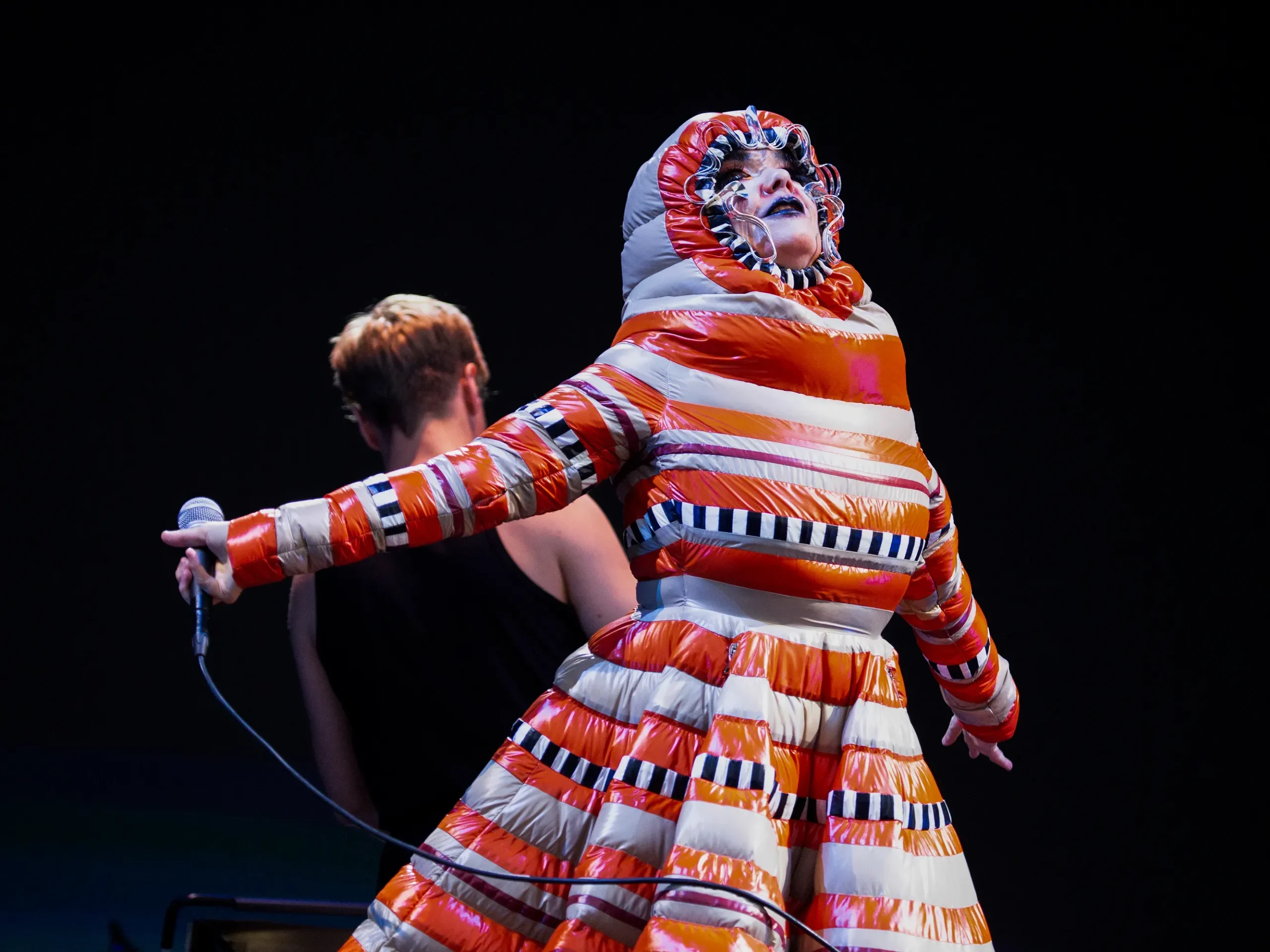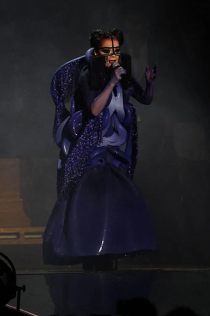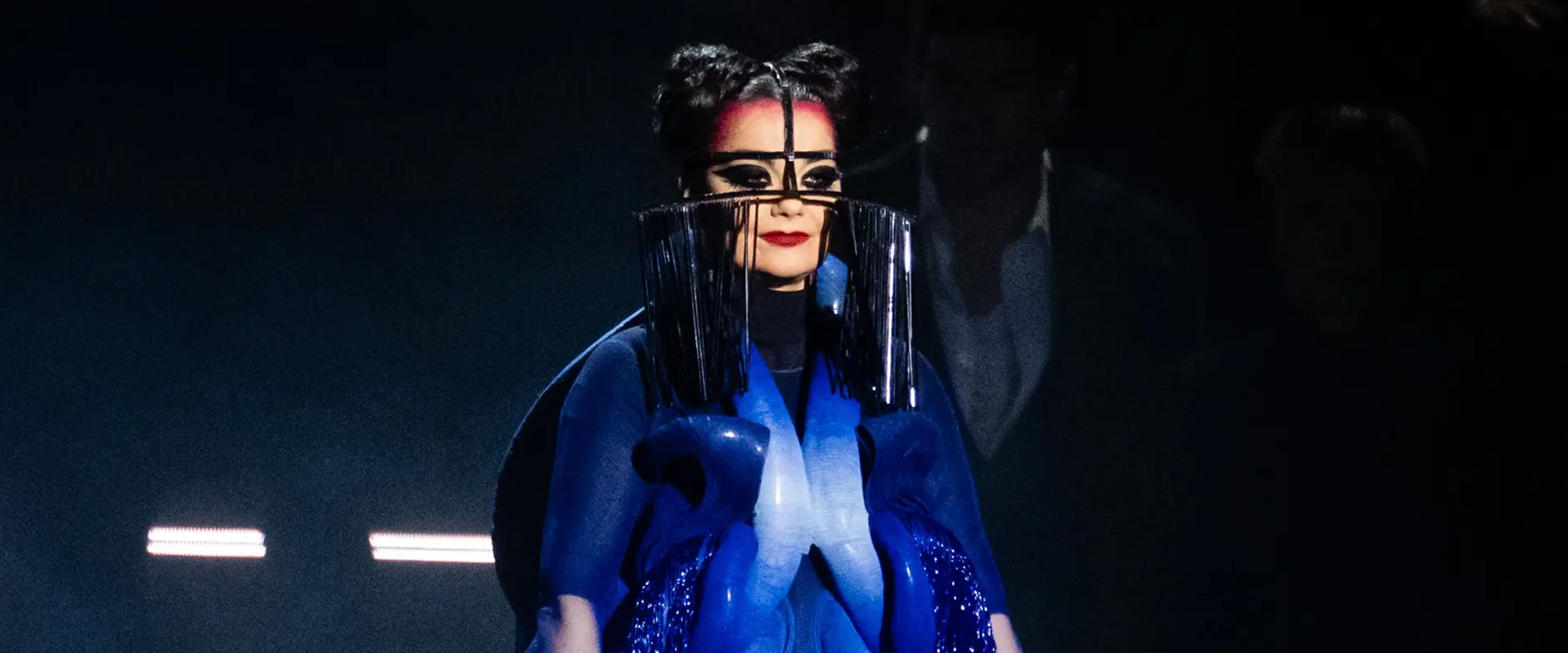 Björk nunca apenas “aparece”. Ela se manifesta visualmente. Cada presença pública da artista carrega uma identidade estética muito bem definida, com figurinos conceituais, direção de arte própria e uma coerência visual construída ao longo de décadas.
